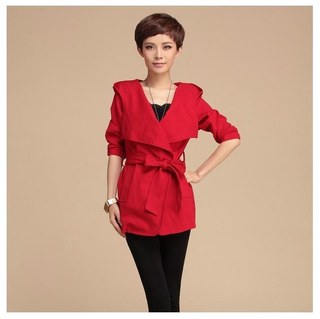 例秀新秋裝休閑連帽大翻領長袖腰帶束腰針織短風衣外套 /