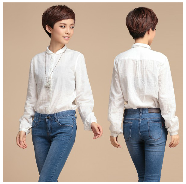 例秀秋裝時尚圓弧小翻領超柔軟透氣雙層純棉長袖襯衫 /