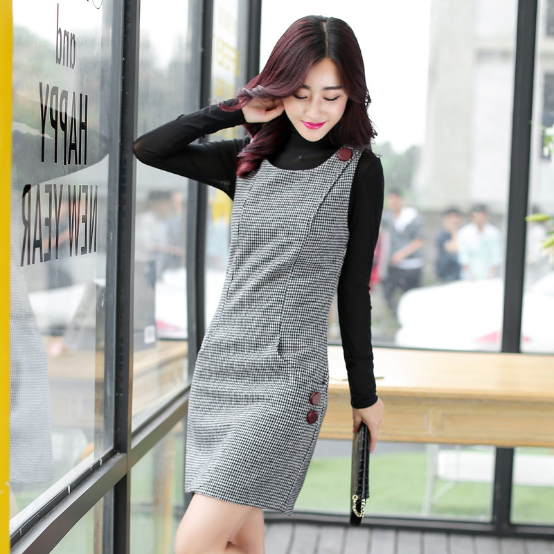 背心裙 千鳥格無袖背心裙連衣裙女毛呢秋冬款馬甲裙毛尼打底裙子 /
