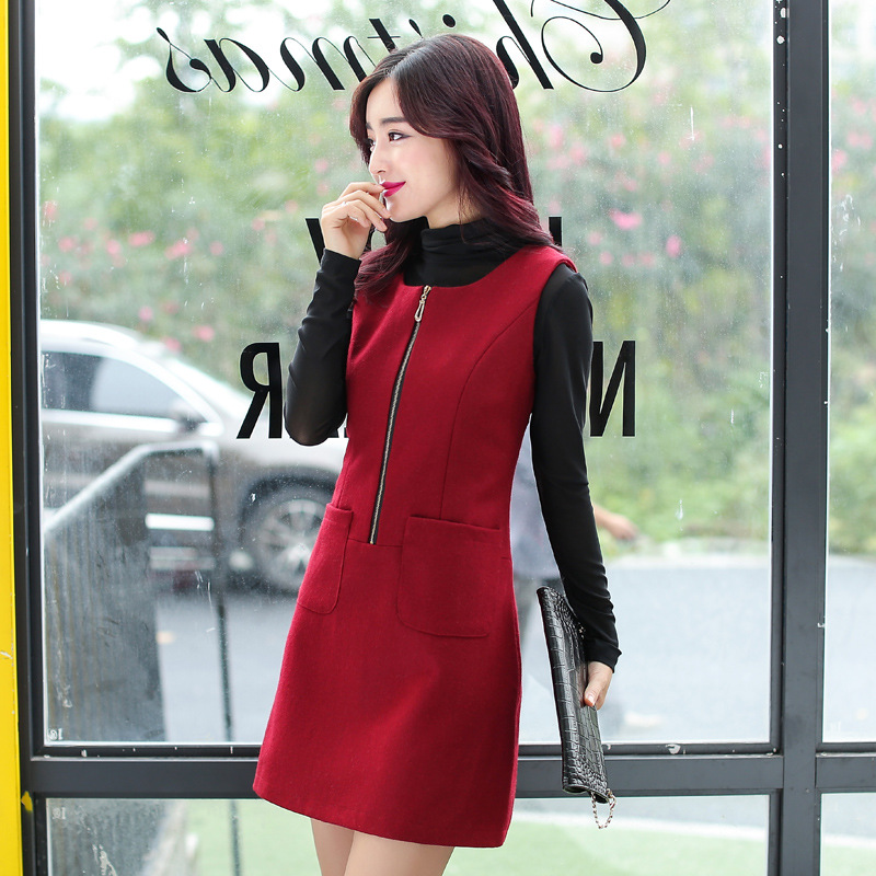 2015秋冬款女裝新款中長款毛呢背心裙冬裙厚冬季無袖馬甲連衣裙子 /