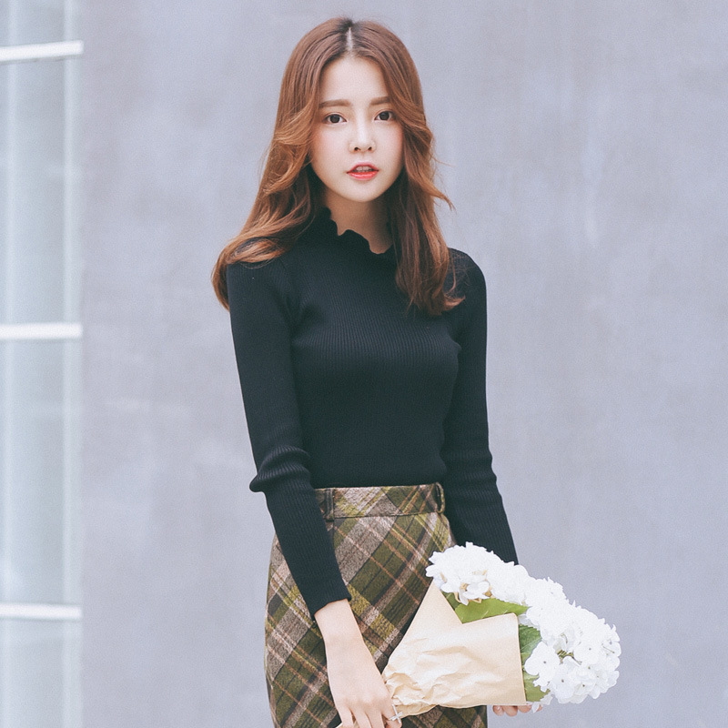 秋冬新款韓版短款毛衣女荷葉領打底衫女長袖套頭加厚顯瘦針織衫女 /
