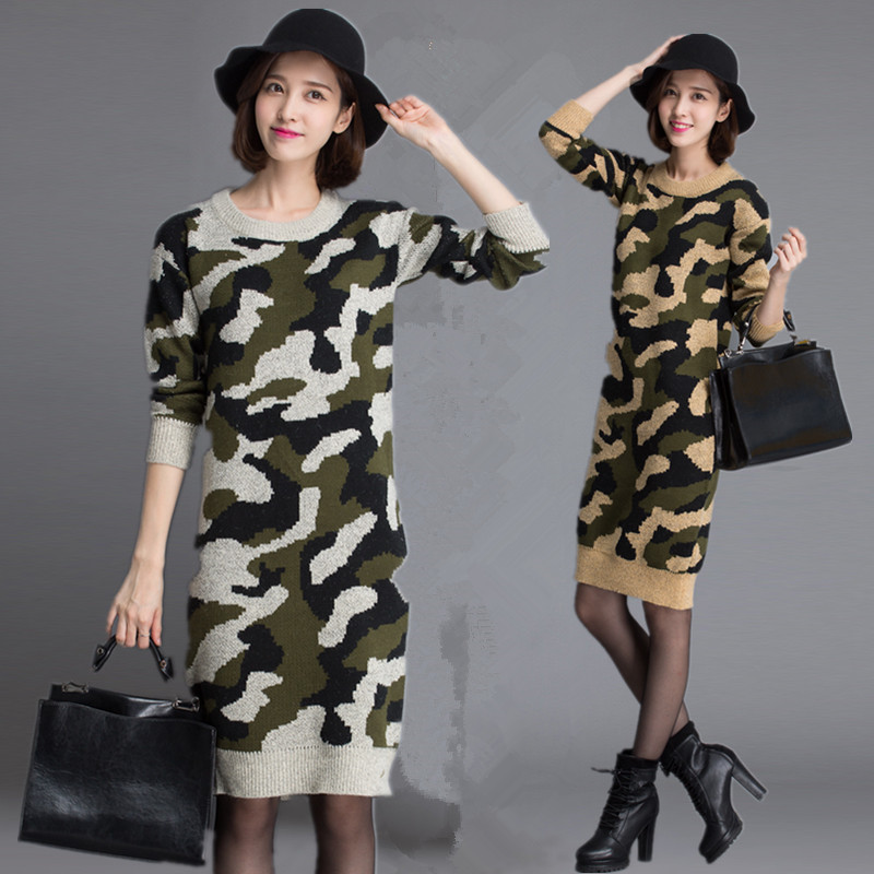 韓國毛衣女士秋冬新款韓版迷彩長袖圓領(lǐng)套頭針織打底長款毛衣裙女 /
