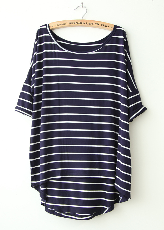 一件代發(fā)莫代爾 柔軟舒服 條紋中袖蝙蝠袖前短后長(zhǎng)T恤 TEE /