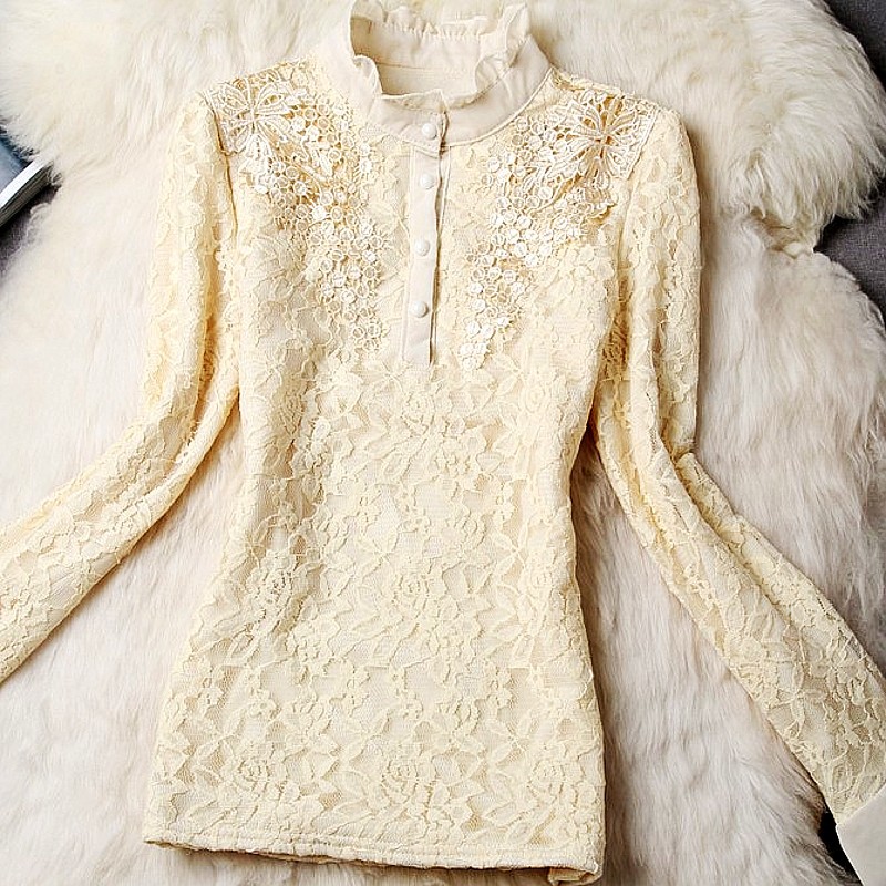 實拍2015新款蕾絲衫長袖秋冬裝女裝韓版修身荷葉邊高領加絨打底衫 /