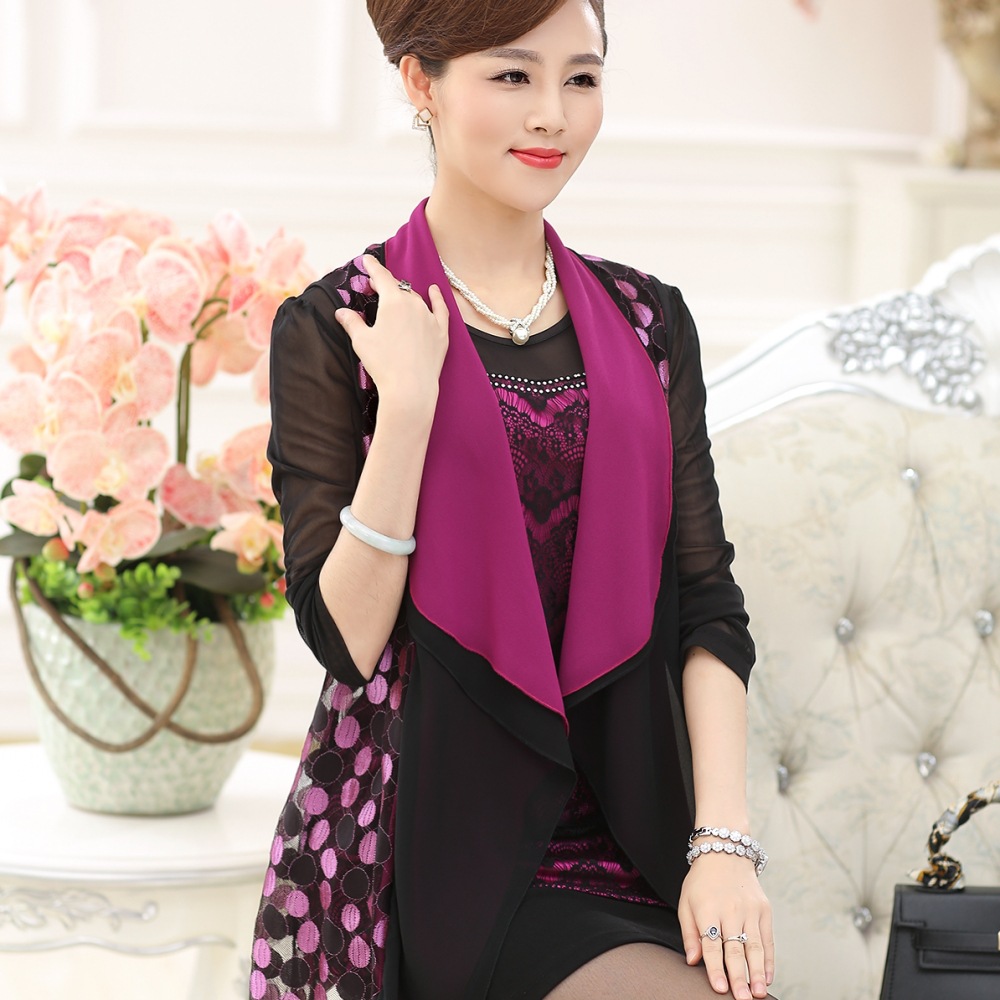 2015秋裝新款媽媽裝紗袖中長款兩件套中老年女裝大碼外套女薄款 /