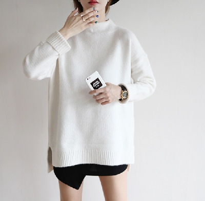 韓國下擺側開叉打底針織衫女套頭中長款加厚寬松半高領毛衣 /
