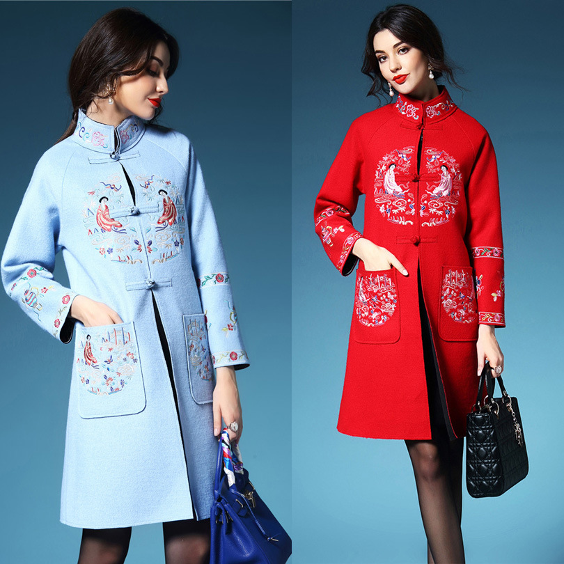 歐美2015冬新款女裝重工復古刺繡立領復古盤扣寬松廓型毛呢外套 /