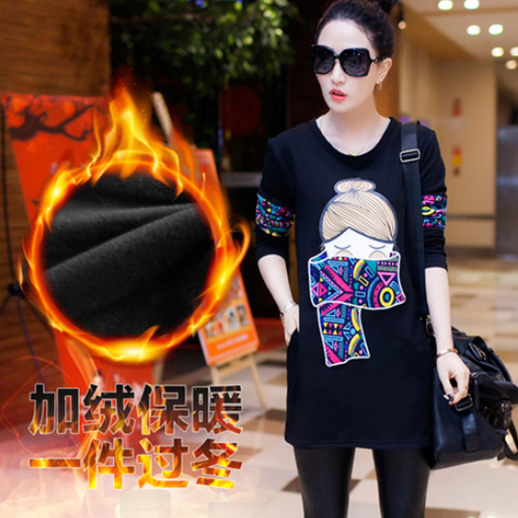2015秋冬印中長款衛衣 加厚加絨打底衫 大碼女裝 /