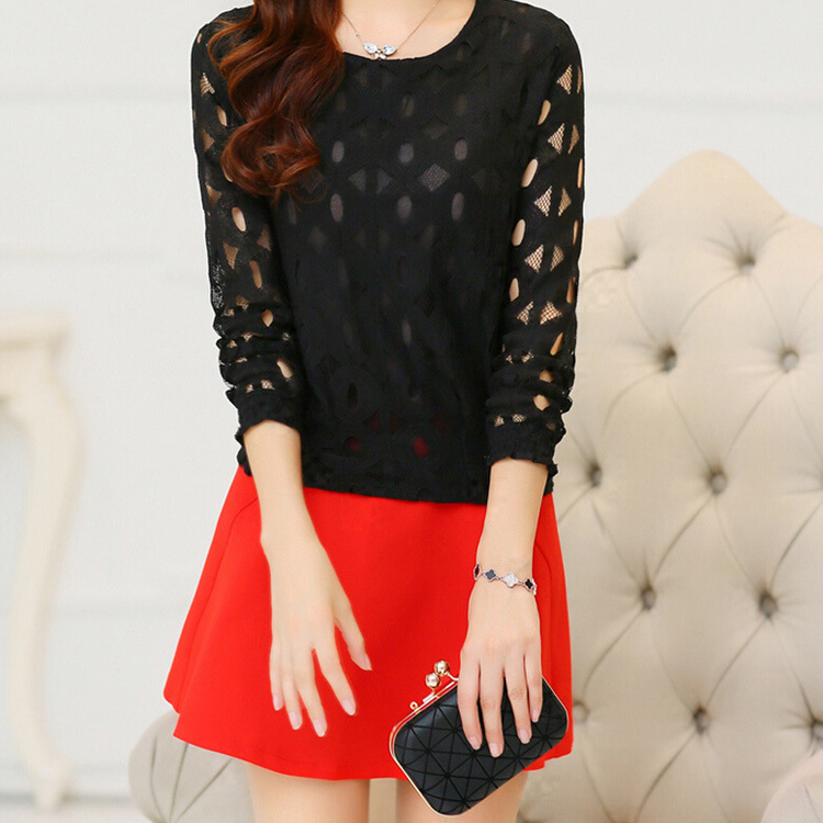 2015秋裝新款長袖秋蕾絲衫 秋季雪紡衫鏤空小衫打底衫女 /