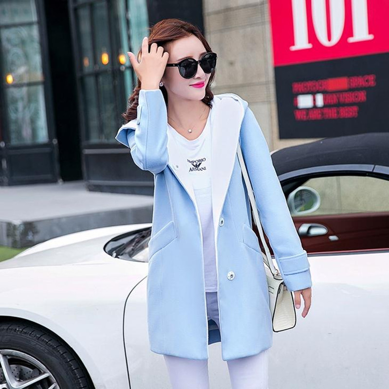 秋冬新款韓版大碼中長款撞色連帽領毛呢大衣修身插袋時尚女裝外套 /