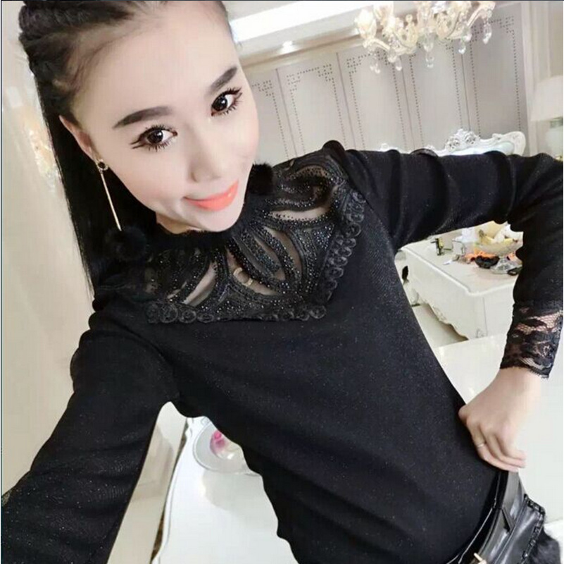 2619歐洲站2015冬季新款時尚網紗上衣小立領性感花邊燙鉆打底衫 /