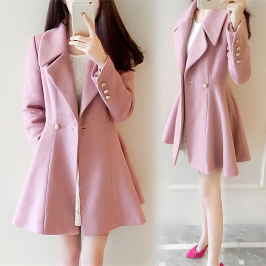 歐洲站2015冬裝新款女裝韓版修身收腰羊毛呢子大衣長袖毛呢外套 /
