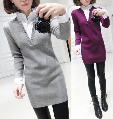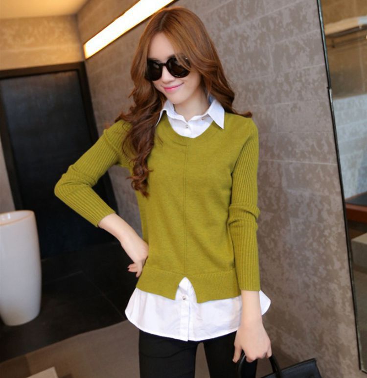 新品2015秋冬季女裝學院風毛衣假兩件套針織衫女式羊毛衫女批發 /
