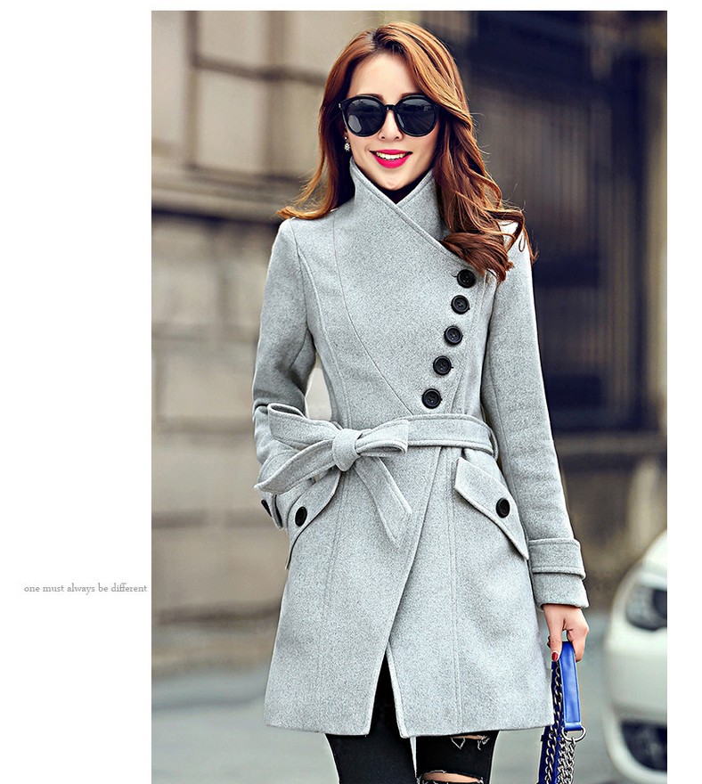 2015秋冬新款韓版中長款修身顯瘦毛呢外套女系帶立領呢子大衣 /