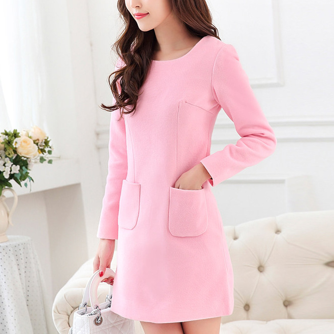 2015秋冬季長袖毛呢連衣裙女中長款淑女包臀呢子打底裙 /