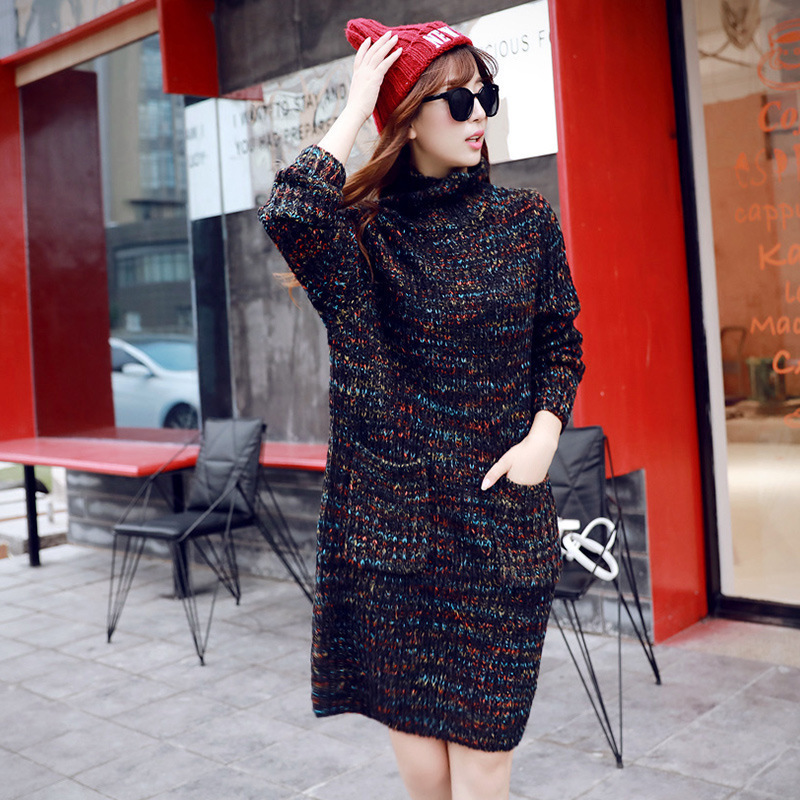 秋冬裝新款中長款長袖厚毛衣連衣裙堆堆領粗針針織衫連衣裙 /