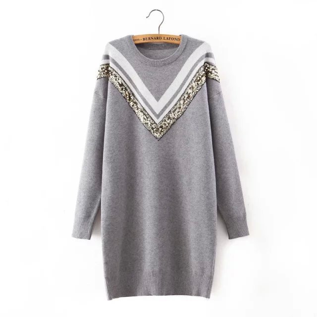 8812-韓版潮2015冬季女裝新款 圓領(lǐng)寬松V形拼色加厚亮片長款毛衣 /