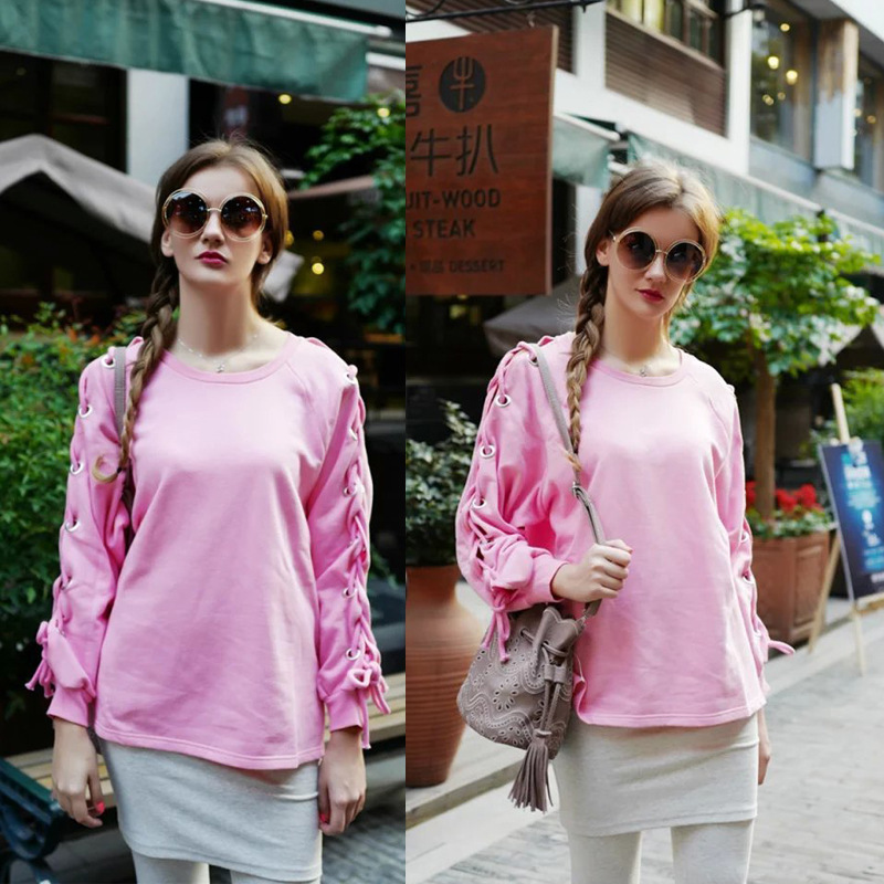 2910-韓版潮15秋冬女裝新款上衣 純色圓領(lǐng)側(cè)邊系帶寬松插肩袖衛(wèi)衣 /