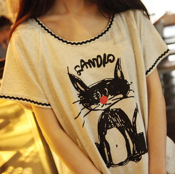 日系2014新款夏季體恤 女款素色花環(huán)貓咪圖案 女士t恤衫 /