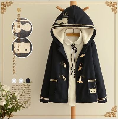 2014新款森女系貓咪刺繡連帽加絨毛呢外套 牛角扣呢大衣 女 /