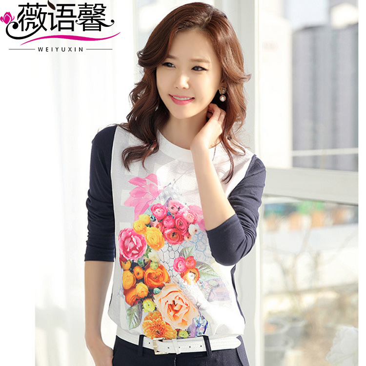秋冬新款韓國時尚媽媽裝百花印花寬松大碼女裝歐根紗打底女式T恤 /