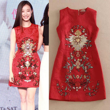2015歐洲站DG走秀款倪妮明星同款釘珠鑲鉆刺繡顯瘦連衣裙 /