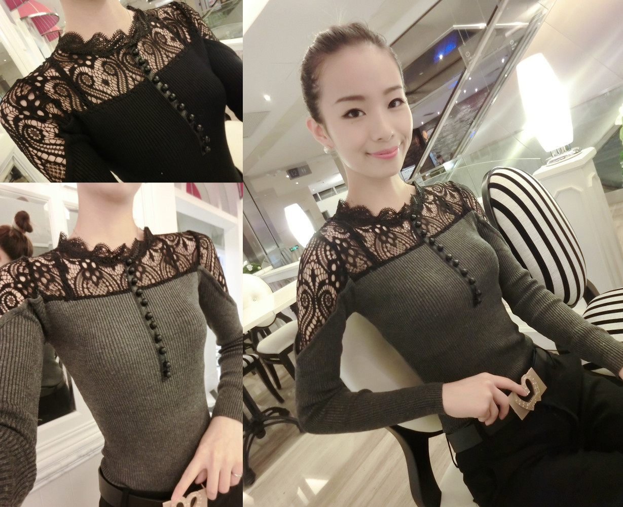 2015秋裝 修身 針織毛衣性感打底衫長(zhǎng)袖拼接蕾絲圓領(lǐng)上衣 /