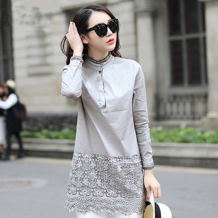 秋季新款女裝襯衫女中長(zhǎng)款氣質(zhì)立領(lǐng)襯衣長(zhǎng)袖蕾絲時(shí)尚打底衫 /