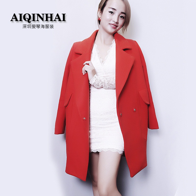 2015女裝冬季新款羊絨大衣橘紅色外套女式毛呢大衣外套女 /