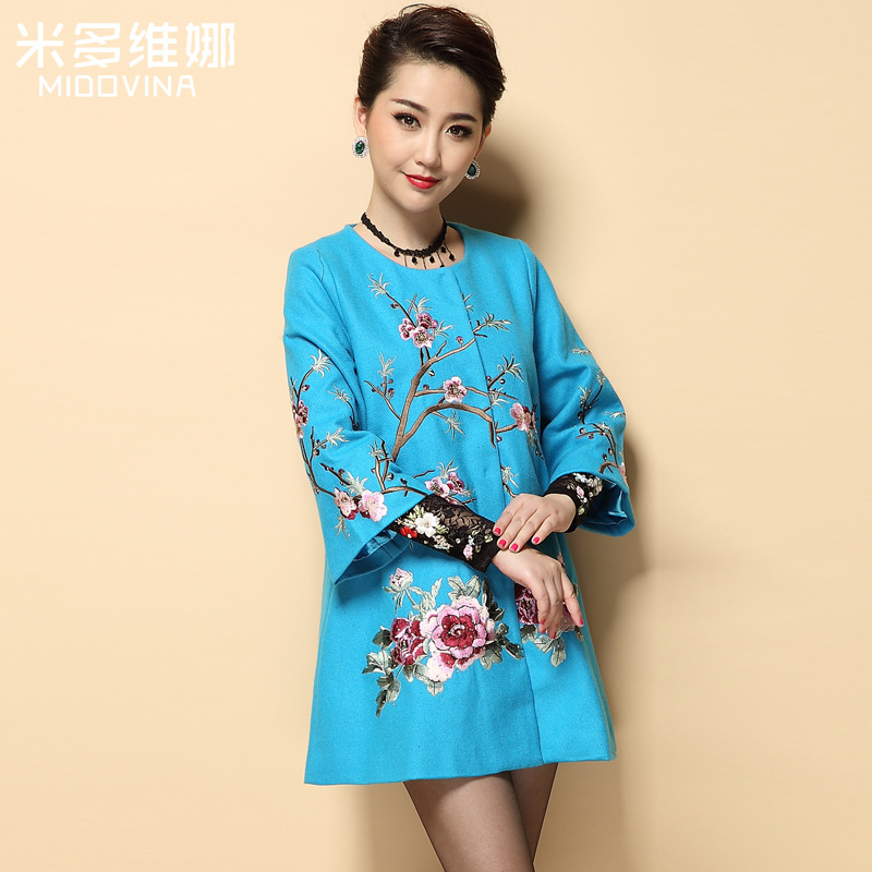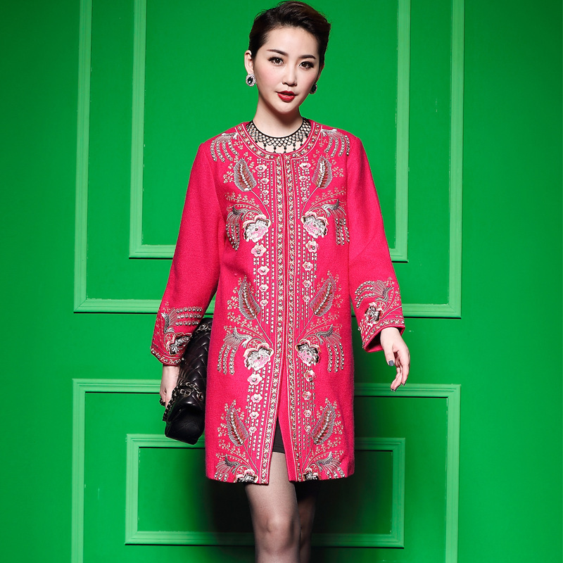 重工繡花中長款毛呢外套2015冬新款民族風(fēng)刺繡修身大碼羊毛呢大衣 /