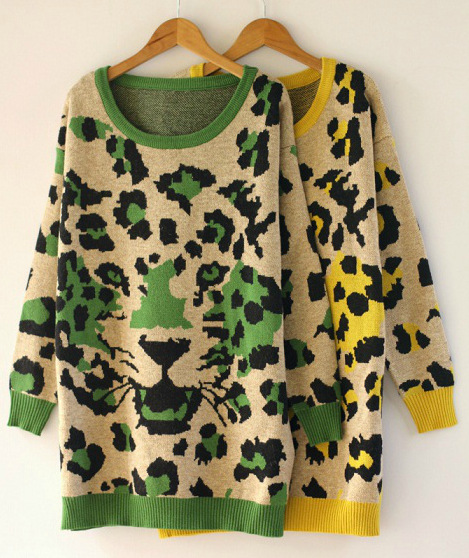 復古豹紋老虎頭加厚雙層提花中長款毛衣寬松打底衫 /
