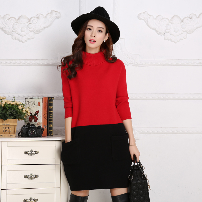 2015冬裝貂絨衫毛衣中長款高領針織衫大碼女裝撞色針織衫 /