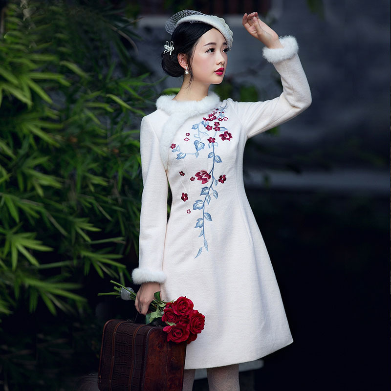 筱姿2015冬裝新款 復古刺繡羊毛修身加厚中長裙 品牌毛呢連衣裙女 /