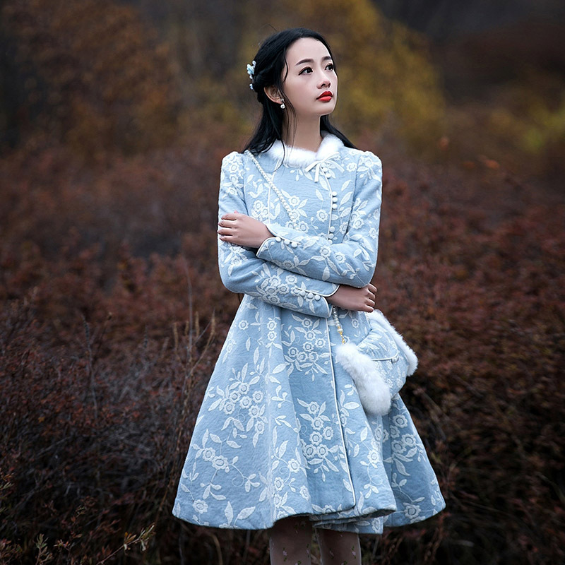 2015冬裝新款女裝 復古兔毛繡花小清新蕾絲毛呢外套 配包包女 /