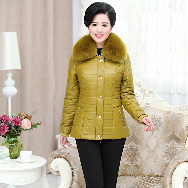 秋冬新款中老年女裝毛領(lǐng)棉衣大碼純色包貨保暖修身PU皮棉服媽媽裝 /