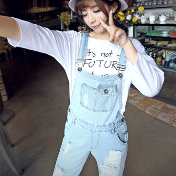 新款秋冬季女式牛仔褲 韓版連體牛仔褲寬松大碼吊帶高腰長褲批發 /