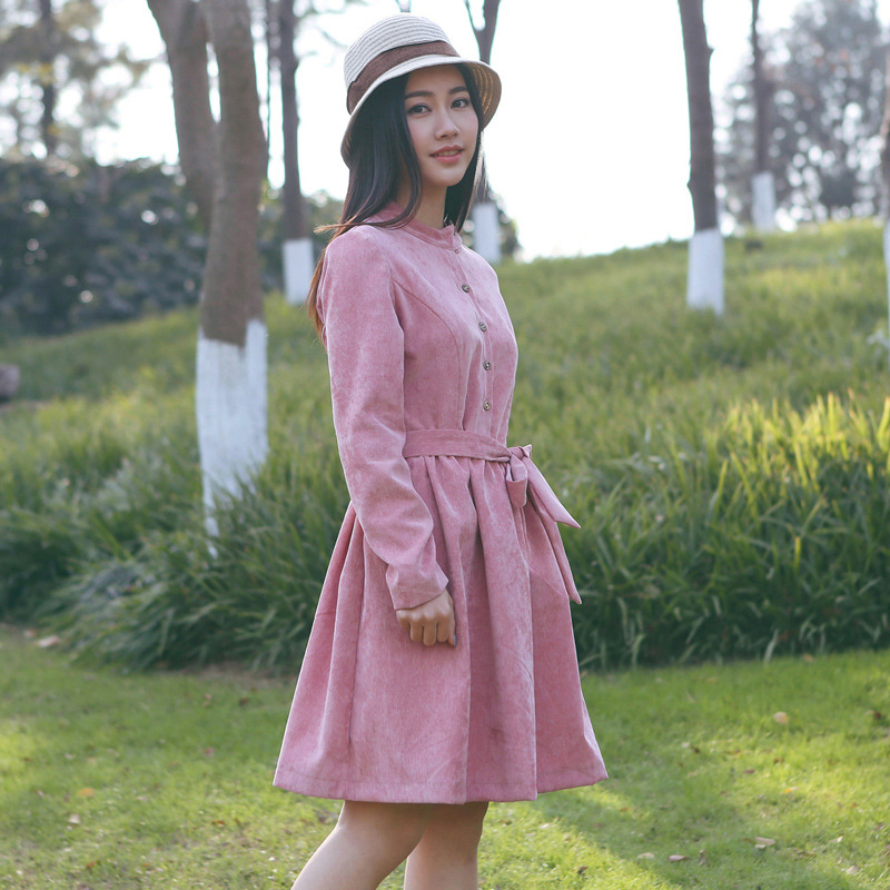 2015春裝新品圓領長袖燈芯絨純色連衣裙文藝復古寬松系帶中裙 /