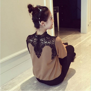 2015冬裝 立領(lǐng)鏤空鉤花 甜美百搭長袖女T恤 /