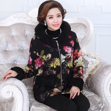 冬季新款中老年女裝連帽保暖加絨棉衣時尚花色中長款媽媽裝棉服 /