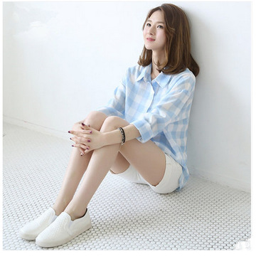 2015秋季韓版雪紡格子襯衫長袖中長款寬松BF風上衣外套 /
