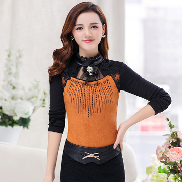 實(shí)拍2015秋冬新款大碼修身 蕾絲拼接加絨加厚麂皮打底衫女批發(fā) /