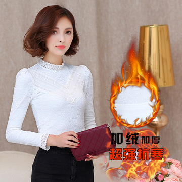 實(shí)拍韓版立領(lǐng)花邊秋冬長袖蕾絲衫加絨加厚打底衫 羊胎絨批發(fā) /