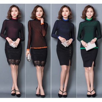2016春季新款雙層網紗拼雙色修身顯瘦小衫高領氣質長袖女士T恤 /