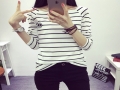 秋裝新款韓版學生海軍風條紋寬松長袖T恤女純棉打底衫潮 /