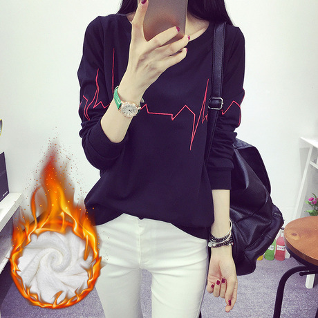 秋冬新款韓版大碼加絨加厚長袖顯瘦女t恤打底衫學生套頭衛衣 /