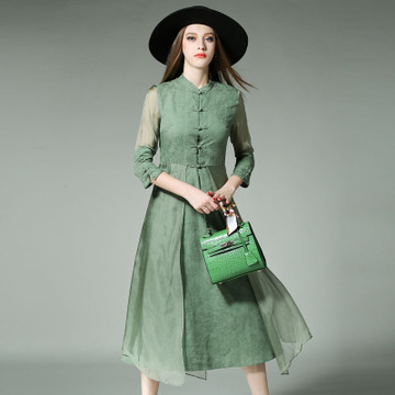 韓版2016春夏新款文藝復古真絲印花不規則裙立領七分袖連衣裙女 /