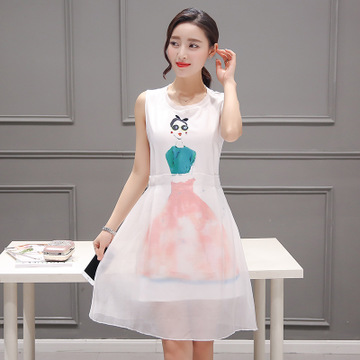 韓版2016夏新款淑女白色圓領無袖中長裙時尚印花雪紡拼接連衣裙潮 /