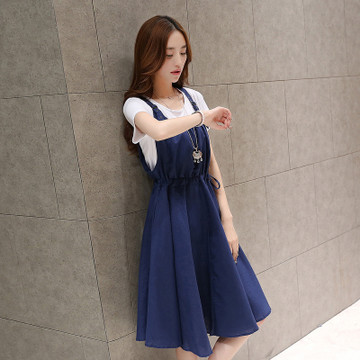 韓版2016夏新款假兩件棉麻文藝范小清新修身顯瘦大擺中長款連衣裙 /