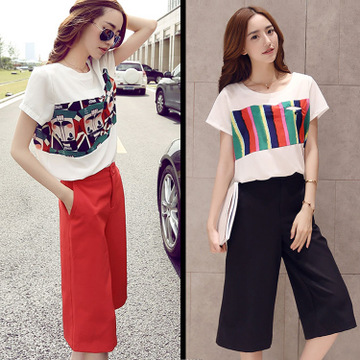 闊腿褲套裝女夏2016歐美時尚休閑雪紡短袖七分褲裙兩件套韓版潮 /