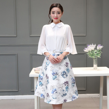 2016韓版印花雪紡裙子短袖連衣裙女夏中長款套裝裙潮 /